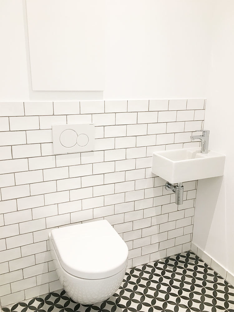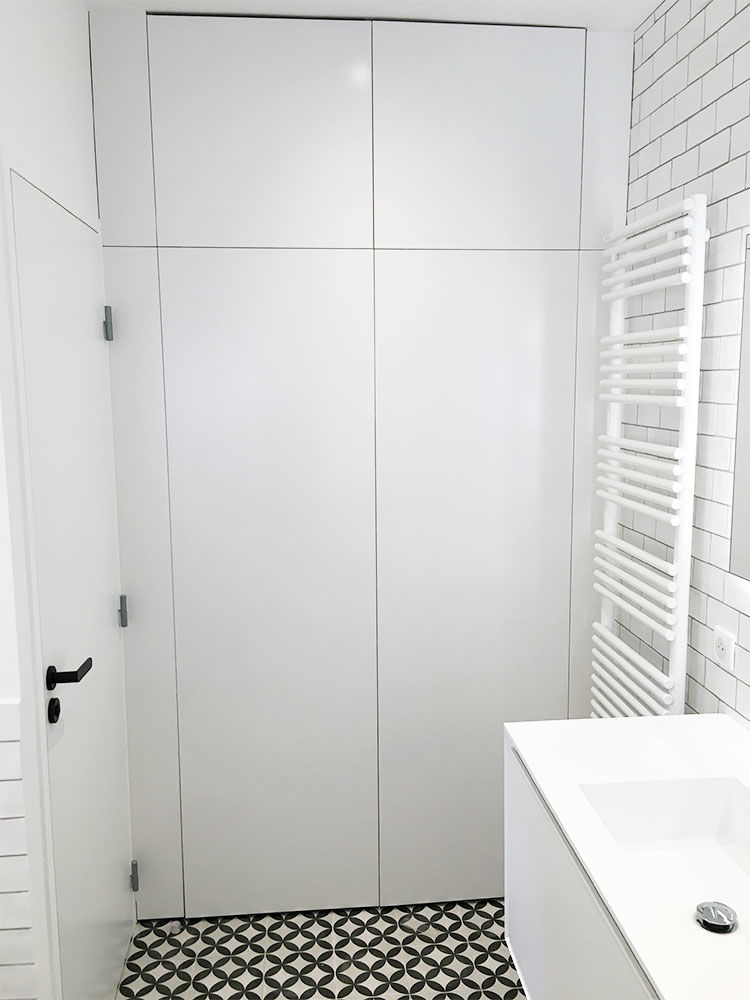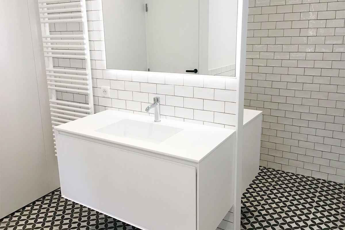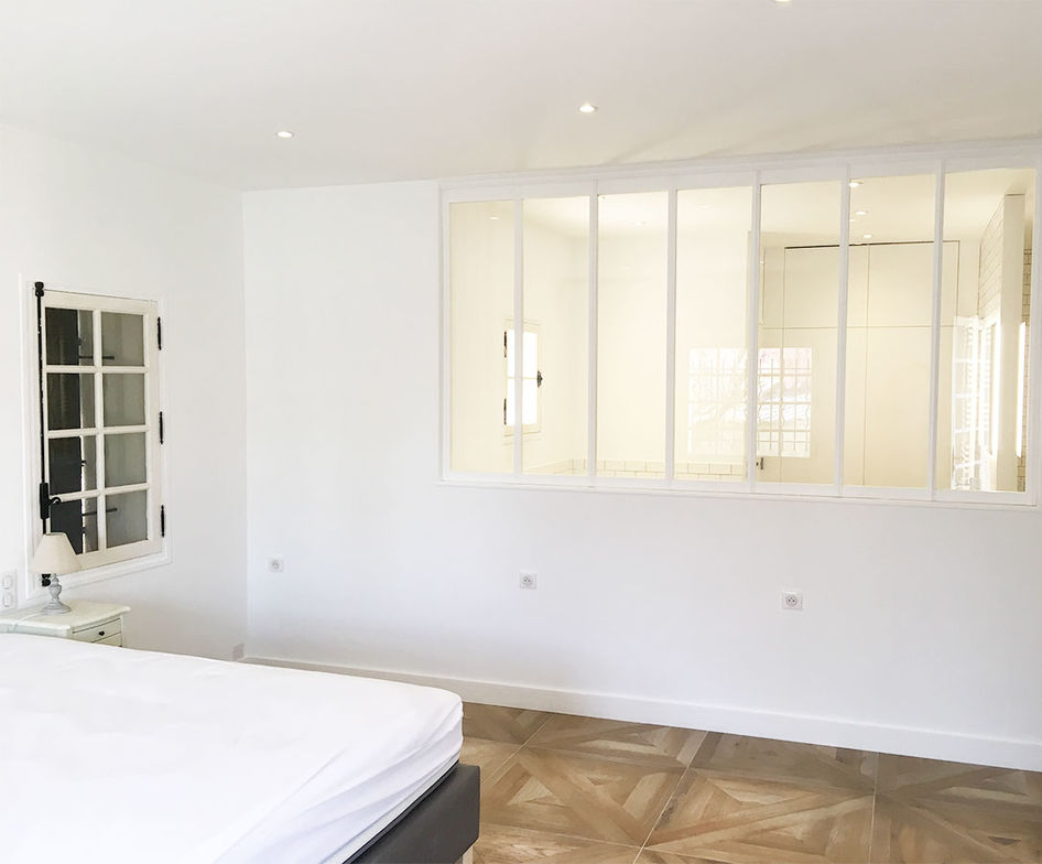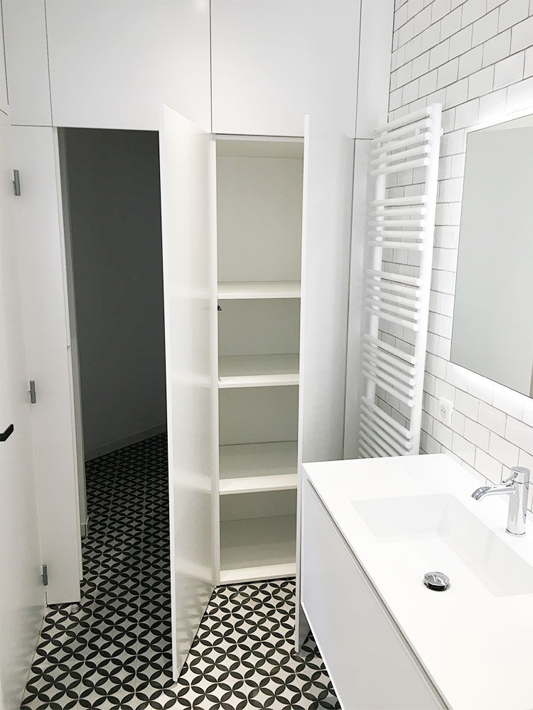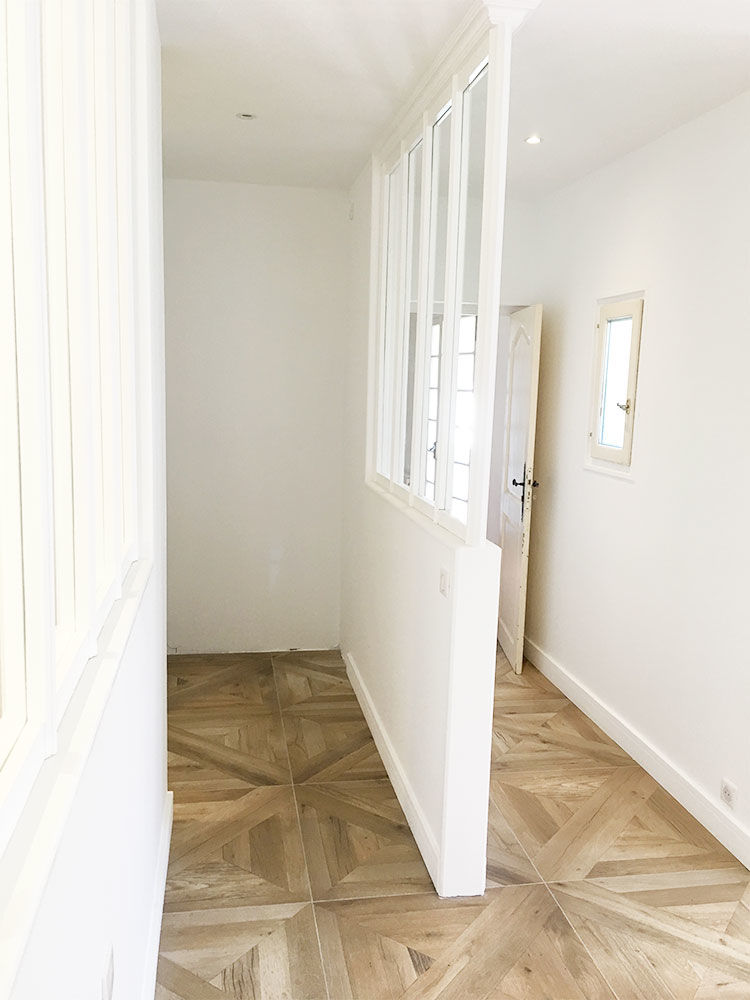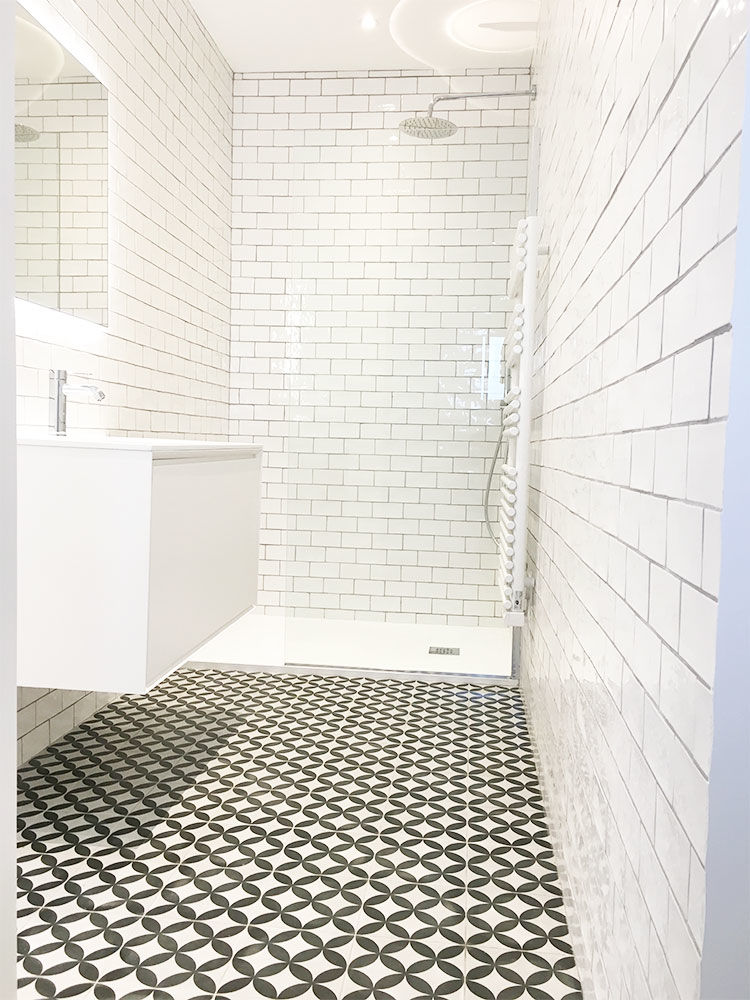 après une redistribution complète, nous avons créé le réseau de plomberie et le réseau d’électricité. Un carrelage graphique très actuel a été choisi au sol alors que des carreaux de faïence habillent l’intégralité du mur. Ces carreaux sont mis en valeur grâce à une teinture des joints plus foncée pour rehausser l’ensemble. Les menuiseries intérieures, le dressing et les verrières sont réalisés sur mesure.