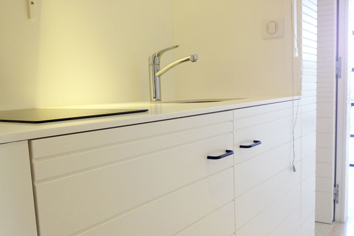 Nous avons réalisé toute la plomberie, l’électricité et la peinture. Les meubles ont été créés par nos soins et sur-mesure évidemment.
