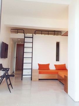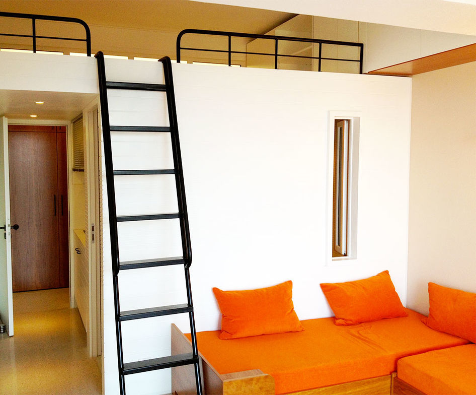 La dépendance de cette maison s’est transformée en un studio fonctionnel et moderne. Pour créer ce studio, nous avons totalement réorganisé l’espace. Un module central a été réalisé en y intégrant une cuisine en HI MACS et une salle d’eau entièrement carrelé en mosaïque. La mezzanine qui surplombe la pièce accueille un lit double et se transforme en une véritable chambre.