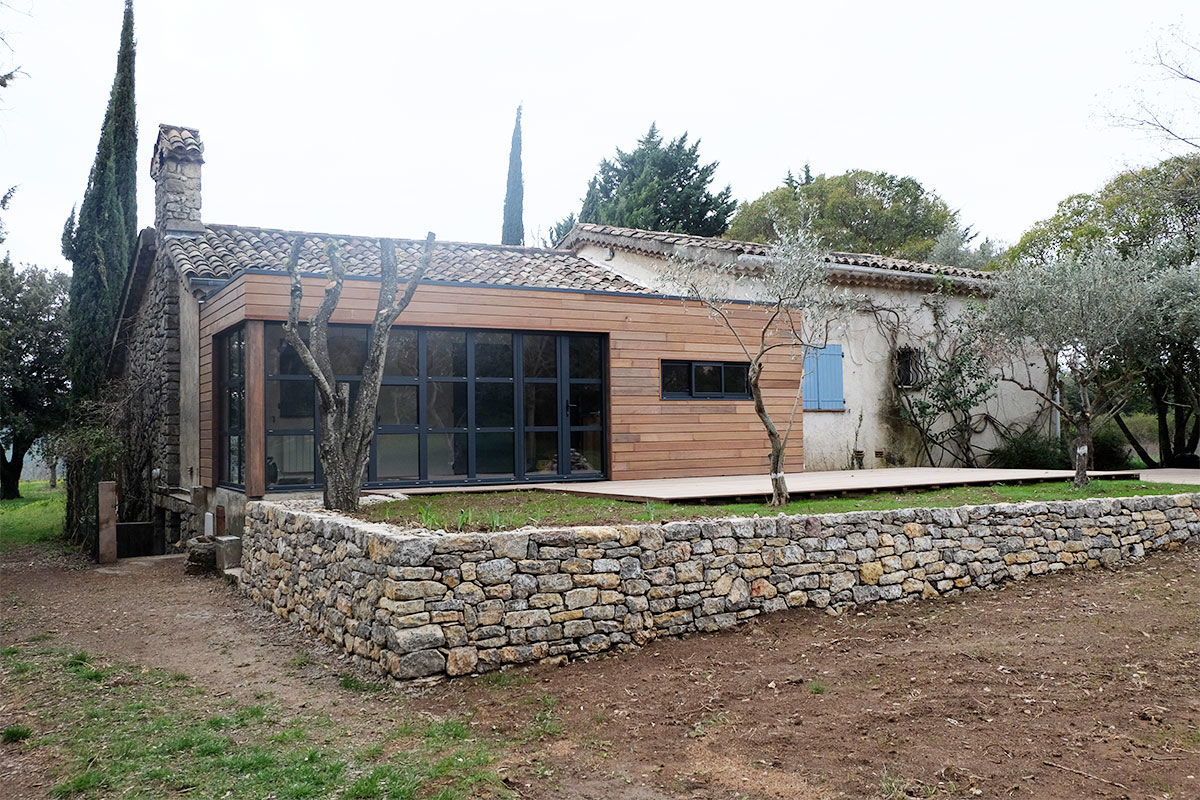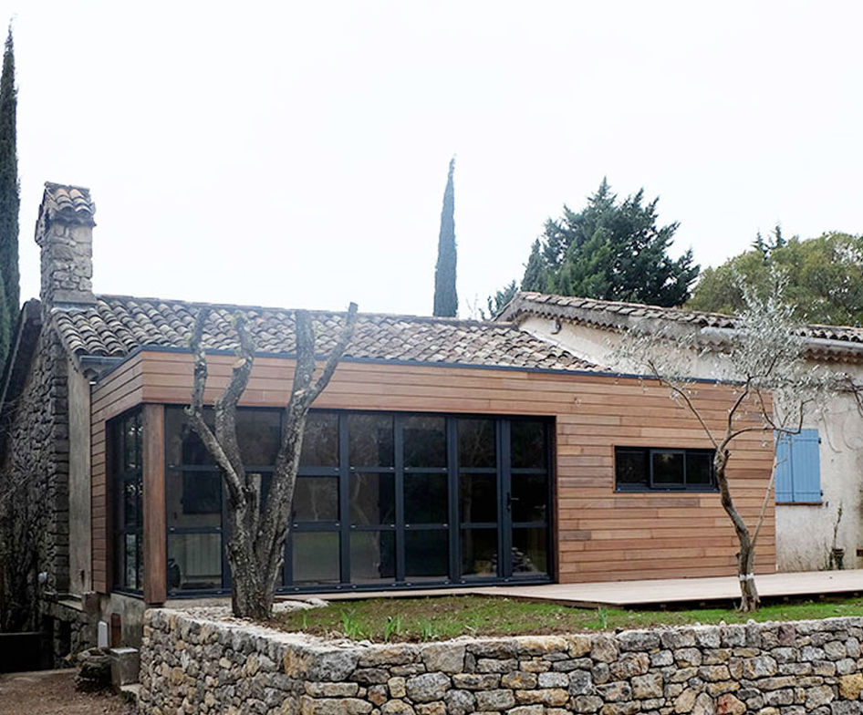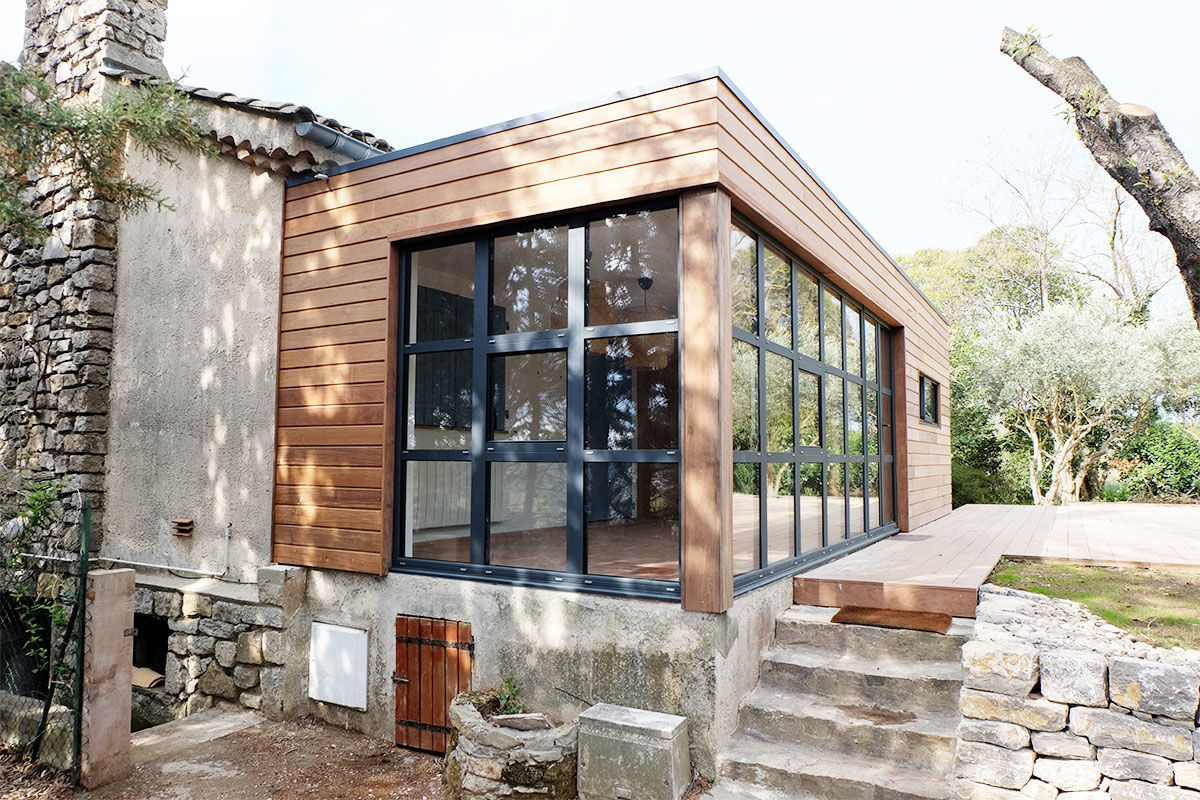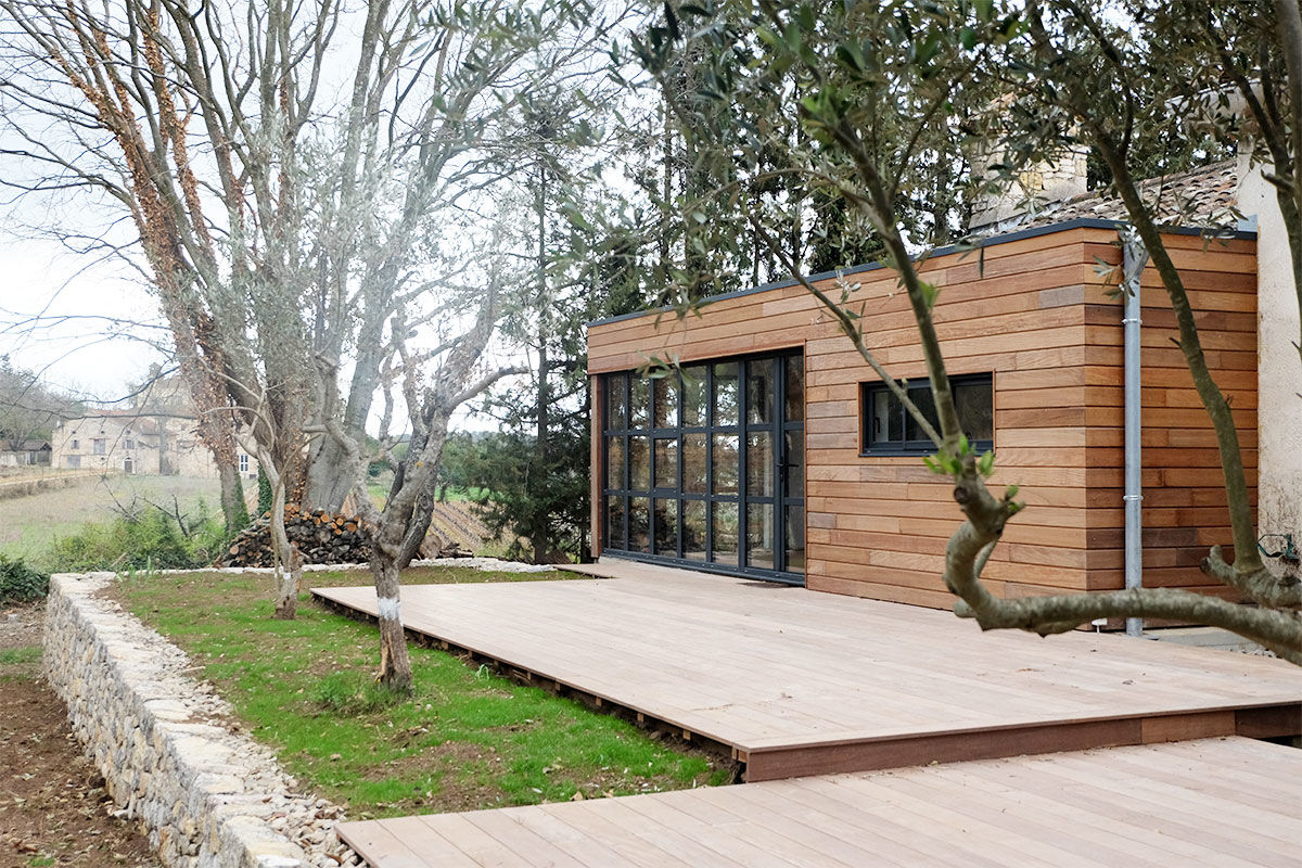 Nous avons donc proposé une extension dont toute l’ossature est en bois. Le bois a des vertus très intéressantes : c’est un excellent isolant et les travaux sont plus rapides. Pour la lumière, nous avons confectionné une large ouverture vitrée parfaitement isolée, ainsi qu’une terrasse en bois Ipé pour profiter des beaux jours.