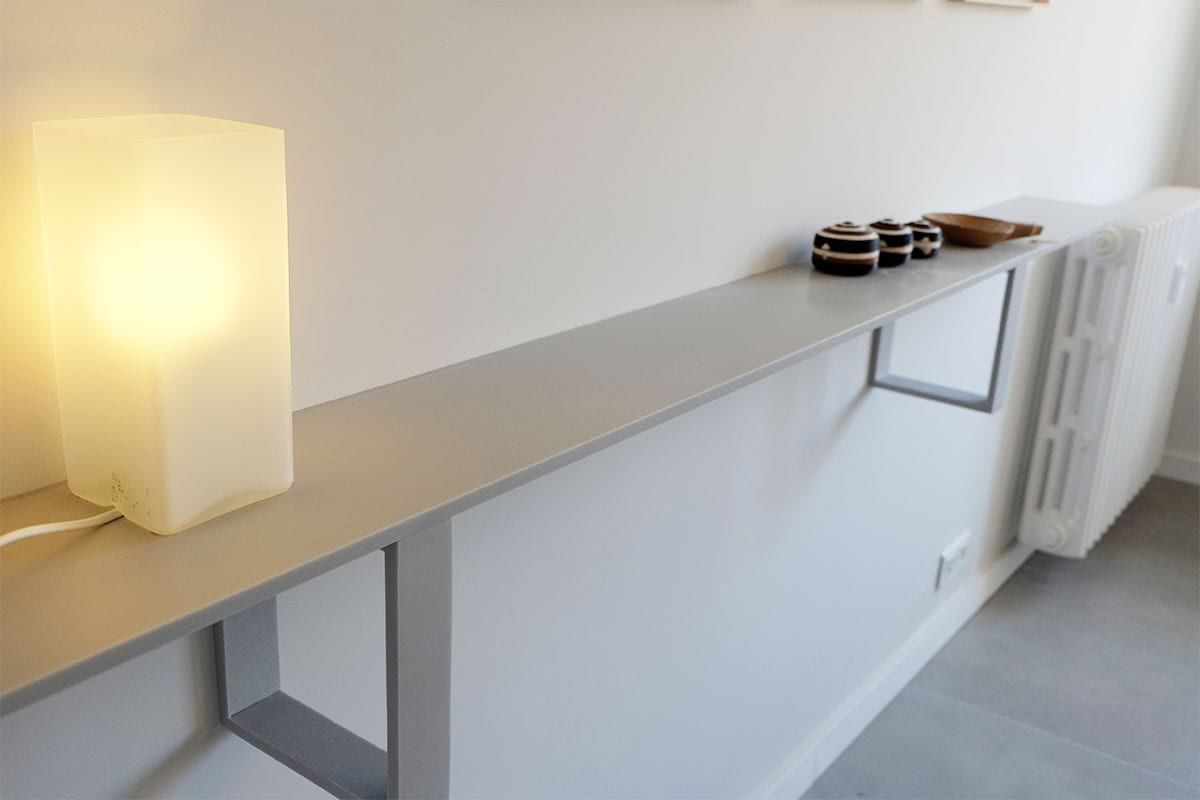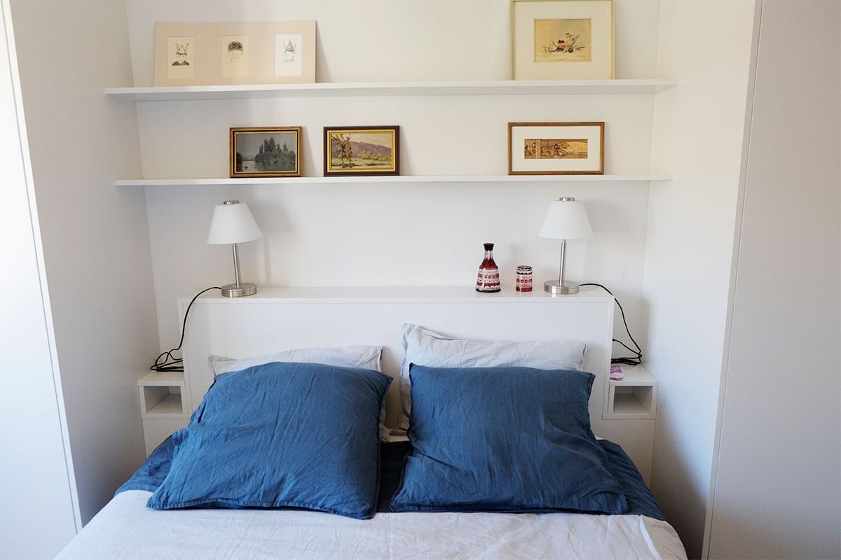 Tout a entièrement été créé puis intégré : la bibliothèque, les armoires, tout l’ensemble tête de lit, et aussi la console et le large bureau. Tout le mobilier a été réalisé sur-mesure.